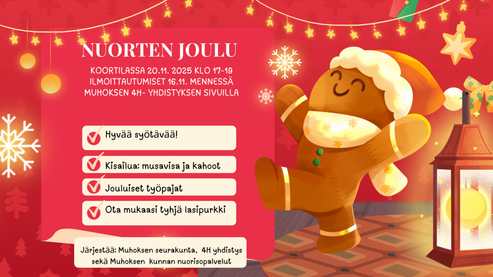 Nuorten Joulu Koortilassa Muhoksen 4H-yhdistys, Muhoksen seurakunta ja Muhoksen kunnan nuorisopalvelut järjestävät nuorille joulu teemaisen illan Koortilassa. Osallistuminen on maksutonta, ja toiminta…