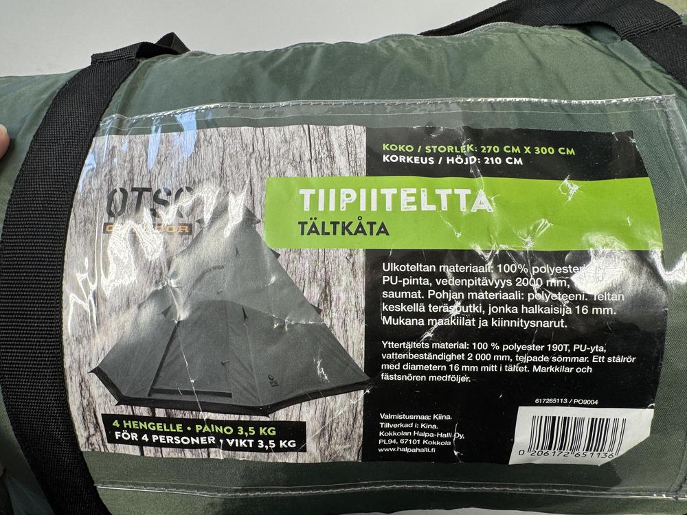 4 hengen tiipiiteltta, koko 270 cm x 300 cm, korkeus 210 cm.