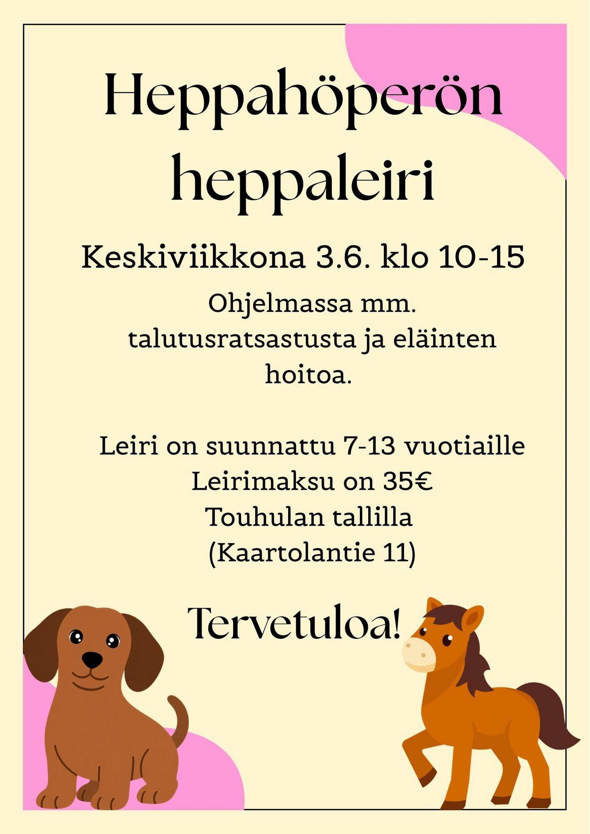 Heppahöperön heppapäiväleiri on 4H-yrittäjän järjestämä hevosiin liittyvä leiri keskiviikkona 3.6.2026 klo 10.00-15.00, jossa leiriläiset pääsevät kokemaan talutusratsastusta sekä eläinten hoitoa.