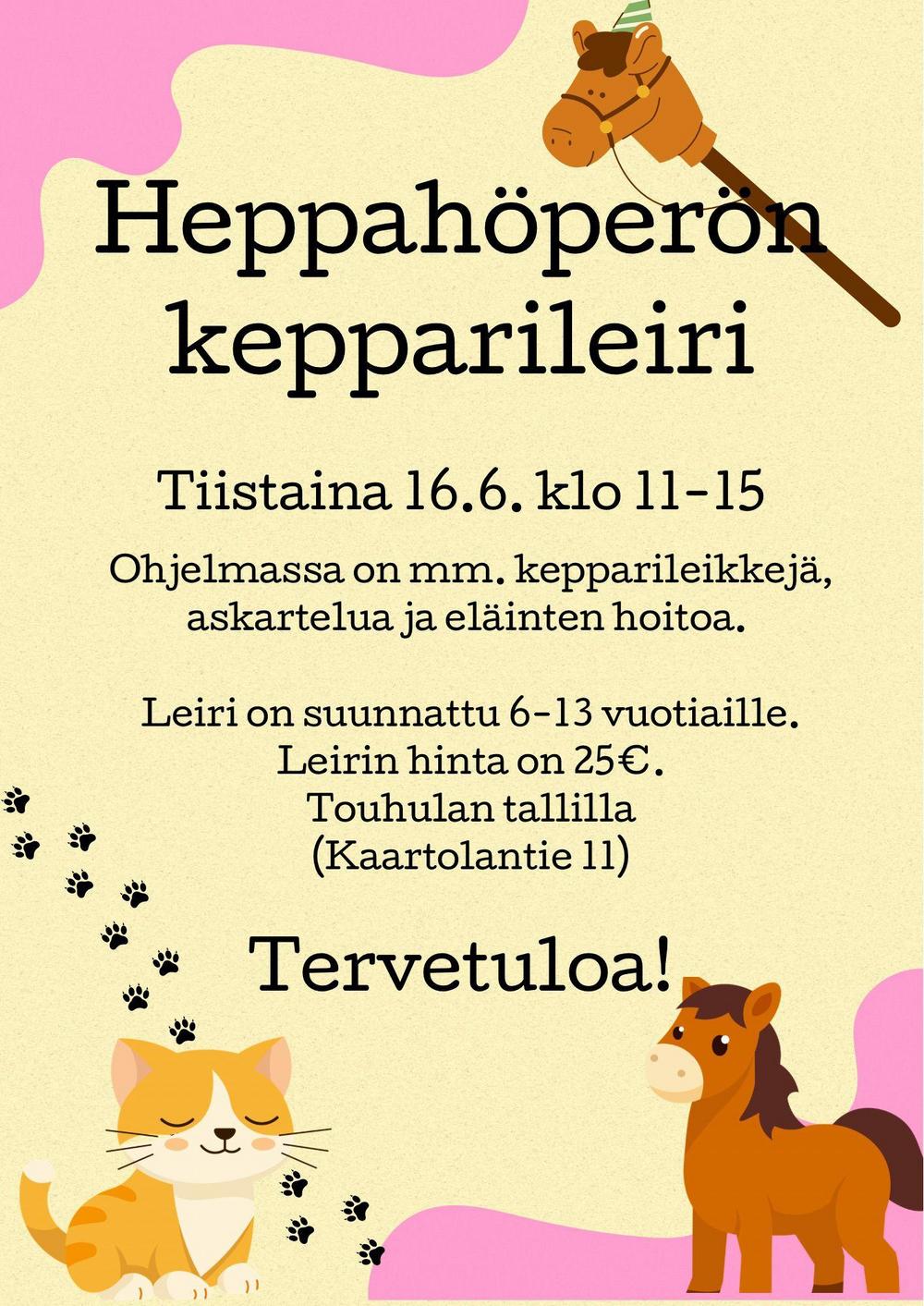 Heppahöperön kepparileiri on 4H-yrittäjän järjestämä keppihevosleikkeihin, askarteluun ja eläinten hoitoon keskittyvä leiri tiistaina 16.6.2026 klo 11.00-15.00
